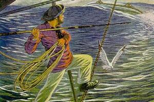 As I’ve mentioned before, 20,000 Leagues Under the Sea has basically four characters, three of whom are obsessed to various degrees with science. The fourth, Ned Land, is a refreshing exception. A sensible, short-tempered harpooner, Land keeps his companions grounded (forgive the pun) every time their resolve falters. Despite disliking his host, Captain Nemo, Land doesn’t hesitate to save his life. Add bravery and a fierce love of life, and Ned Land turns out to be quite a manly fellow.