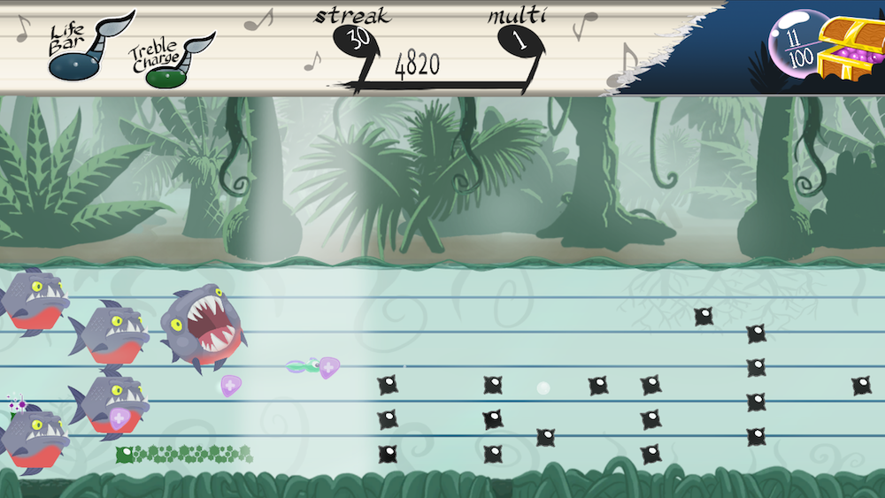 Each stage of the game is basically a long musical staff, along which players must dodge the notes of the stage’s musical score. It’s a neat intersection of music and gameplay: two elements of game design that are too often disconnected.